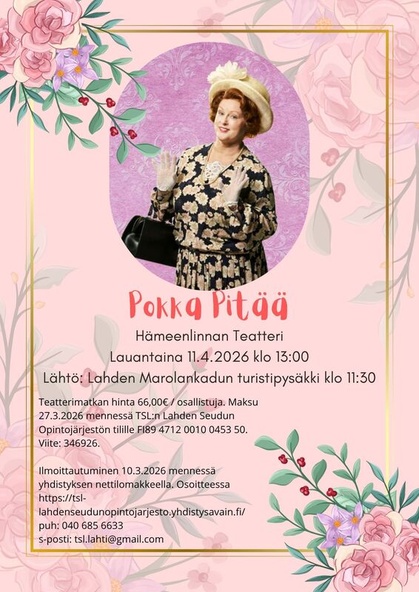Ilmoittautuminen sähköpostilla tsl.lahti@gmail.com 12.3.2026 mennessä, maksu 20.3.2026 mennessä.