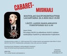 - Lähdimme tekemään hyvin viihdyttävää, mutta myös puhuttelevaa musikaalia, kommentoi ohjaaja Maiju Sallas. Kouvolan Teatterin lauluvoimainen näyttelijäkaarti vahvistuu entisestään Cabareta varten, kun Terhi Suorlahti, Juha-Pekka Mikkola, Karlo Haapiainen ja Konsta Reuter saapuvat vierailijoiksi Kouvolaan. Lisäksi Iikka Kahri johtaa liveorkesteria totutulla laadulla. Willkommen, bienvenue, welcome!Syntisellä Kit Kat Klubilla Berliinissä kaikki on mahdollista. Rakkaus kukoistaa ja syntiset sisäänsä sulkevat seinät pitävät muun maailman murheet ulkopuolellaan. Kyseiselle klubille eksyy myös amerikkalainen kirjailija Clifford Bradshaw (Juha-Pekka Mikkola), joka kohtaa elämänjanoisen laulajan Sally Bowlesin (Terhi Suorlahti). Kukaan ei ajattele tulevaisuutta. Elämä eletään hetkessä - tässä ja nyt. Hauskanpidon aika on kuitenkin pian ohi, kun univormuiset hahmot marssivat lähemmäs ja lähemmäs. On tullut maksun aika. Arki muuttuu synkäksi, vihaiseksi ja pelokkaaksi.